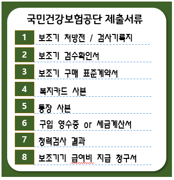 보청기전문점과 이비인후과에서 받은 모든 서류는 국민건강보험공단에 제출해야 합니다. 다음은 공단에 제출해야 할 서류목록입니다.