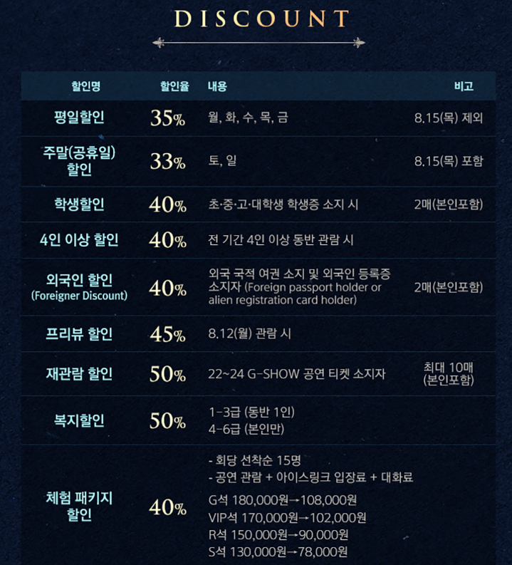 - G1구역, G4구역 1~3열은 단차가 없습니다. 예매에 참고 부탁드립니다.