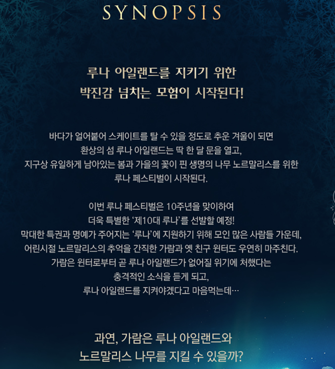 기후 변화로 극심한 여름과 겨울만 남아있는 지구.바다가 얼어붙을 정도로 추운 겨울 중 딱 한 달, 봄과 가을이 공존하는 생명의 나무 '노르말리스'를 위한 '루나 페스티벌'이 개최됩니다.