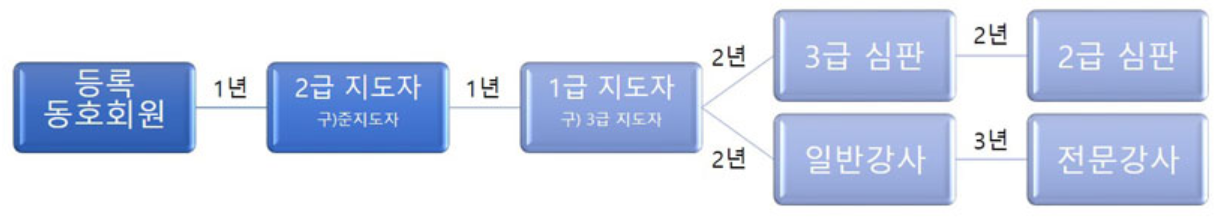 | 2급 지도자 | 본 협회 회원으로 등록 후 1년 이상 활동한 자 동호회원 자격 유지돼야 자격증 자격 유지 가능 |