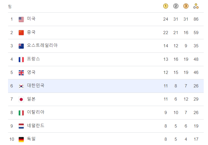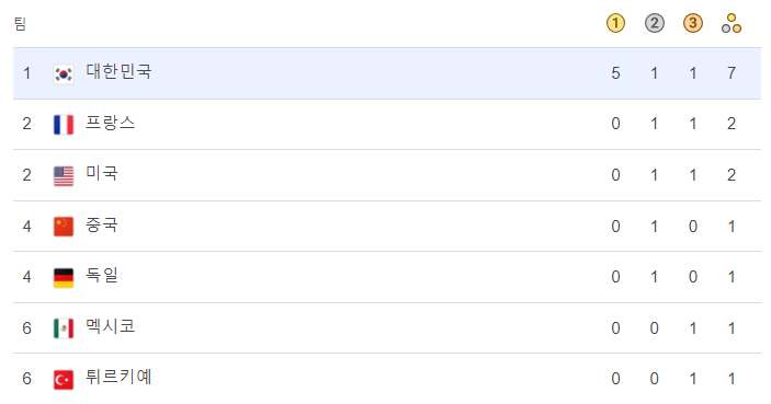 8월 7일 현재 대한민국은 금메달 11개, 은메달 8개, 동메달 7개로 종합순위 6위를 달리고 있습니다. 아직까지 태권도 경기가 남아 있으니 마지막까지 응원합니다.