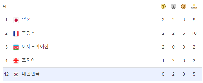 유도 종목에서는 은 2, 동 3으로 5개의 메달을 획득했음에도 불구하고 안타깝게 금메달을 놓쳐 종합순위에서는 12위를 기록하였습니다.