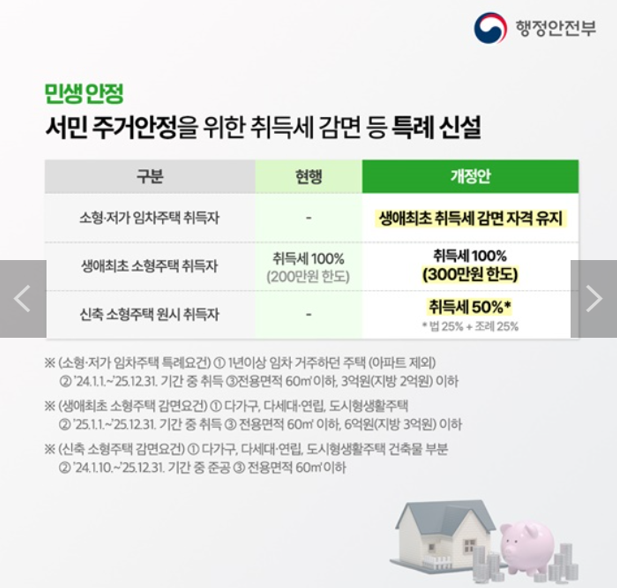 - 소형주택*(아파트 제외) 생애최초로 구입 시, 취득세 감면(100%) 한도: 현행 200만원에서 300만원으로 상향