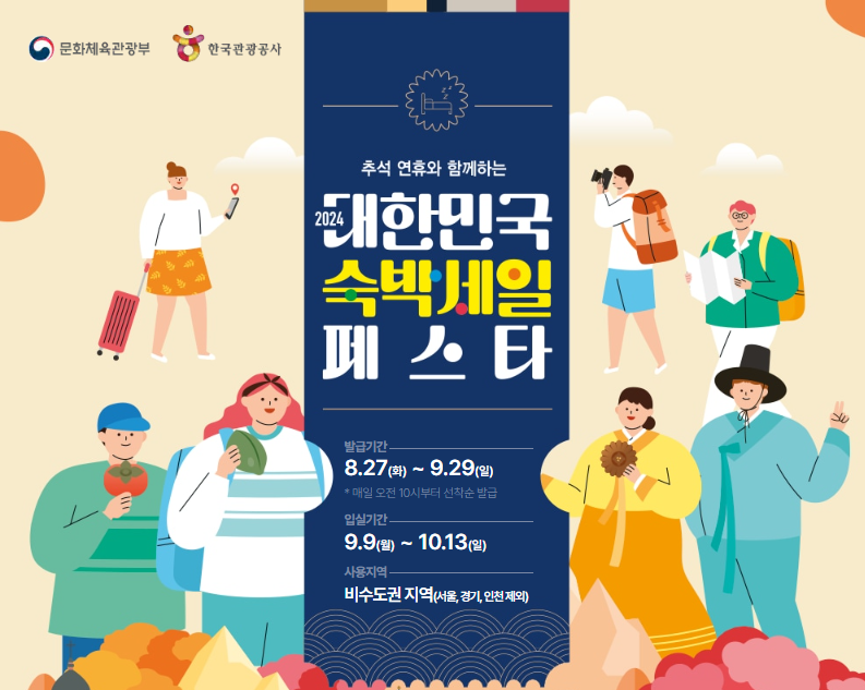 추석 명절 맞이 ‘대한민국 숙박세일 페스타’가 8월 27일(화)에 시작됩니다. 전 국민을 대상으로 비수도권 지역에서 사용 가능한 숙박할인권 20만 장을 배포한다고 합니다. 오늘은 추석연휴 숙박세일 페스타 숙박 할인권 발급 안내와 할인 혜택 등에 대해 자세하게 알아볼까 합니다. 추석 연휴 국내 여행을 계획하시는 분들은 이 기회 놓치지 마세요.