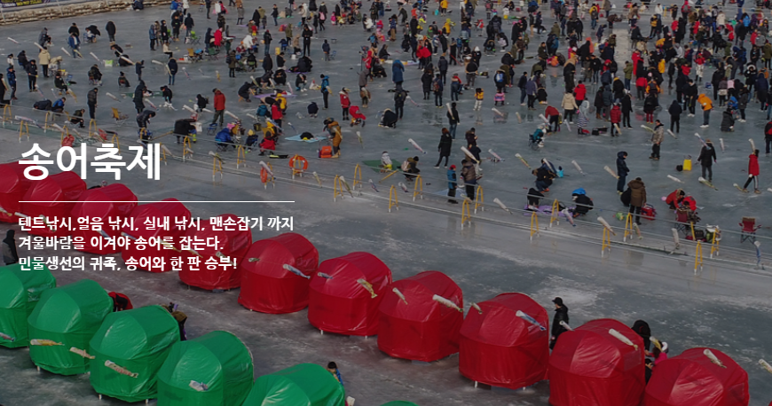 어느덧 2024년도 몇일 남지 않았네요. 나라 안밖으로 참 많은 일들이 있었네요. 그런만큼 한해의 마무리는 잠시나마 근심은 내려놓고 가족과 함께 편안하고 즐거운 시간을 보낼 수 있는 겨울 여행 축제를 추천할까 합니다. 바로 16회를 맞는 평창 송어 축제입니다. 지역 축제로는 오랜 역사와 많은 인기가 있는 만큼 후회하지 않은 겨울 여행 축제가 되리라 생각합니다.
