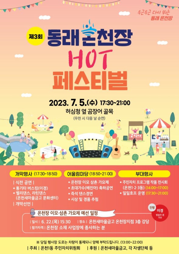 - 행사소개: 동래온천장 HOT 페스티벌은 동래온천을 중심으로 열리는 축제로, 온천 체험과 함께 다양한 문화 행사가 열립니다.