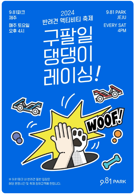 - 행사소개: 구팔일 댕댕이 레이싱은 제주도에서 열리는 반려견과 함께하는 액티비티 축제로, 반려견과 반려인이 함께 다양한 레이싱과 이벤트를 즐길 수 있는 행사입니다. 이 축제는 9.81 파크에서 진행되며, 반려견과 함께하는 다양한 프로그램을 통해 즐거운 시간을 보낼 수 있습니다.