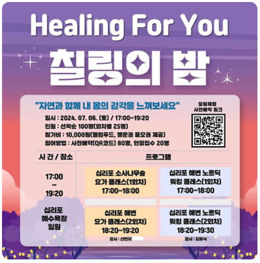 - 행사소개: 인천서해 바다의 아름다운 경관을 보유한 십리포 해수욕장을 알리고, 방문객들에게 느긋한 시간을 보내는 것을 의미하는 '칠링'을 주제로 십리포에서의 특별한 경험을 선사하기 위한 행사