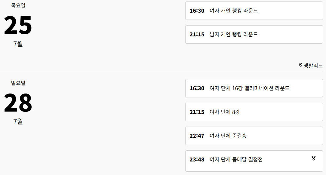 | 여자 | 단체전 | 07월 29일 | 00:11 |